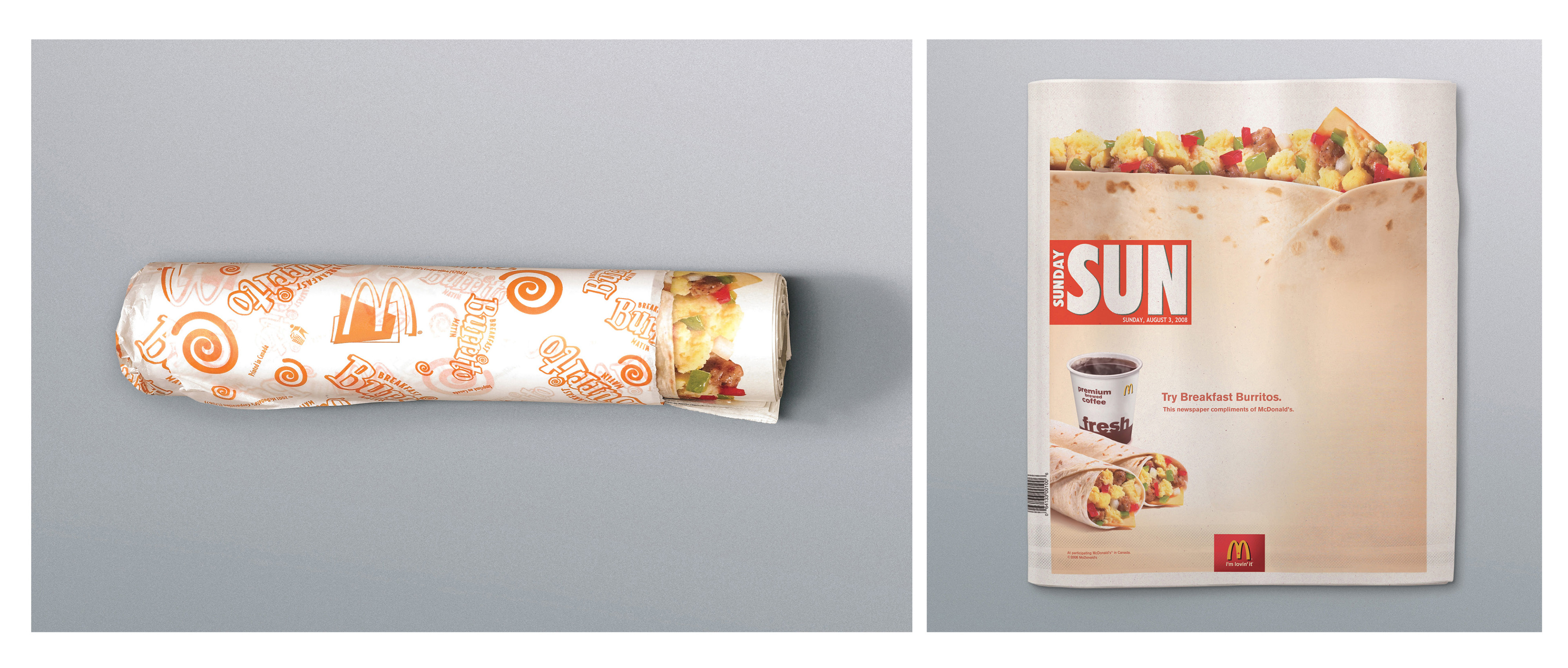 A strategically placed "egg, sausage and cheese" front page domination combined with a burrito wrapper turns your morning paper into a giant McDonald's Breakfast Burrito.